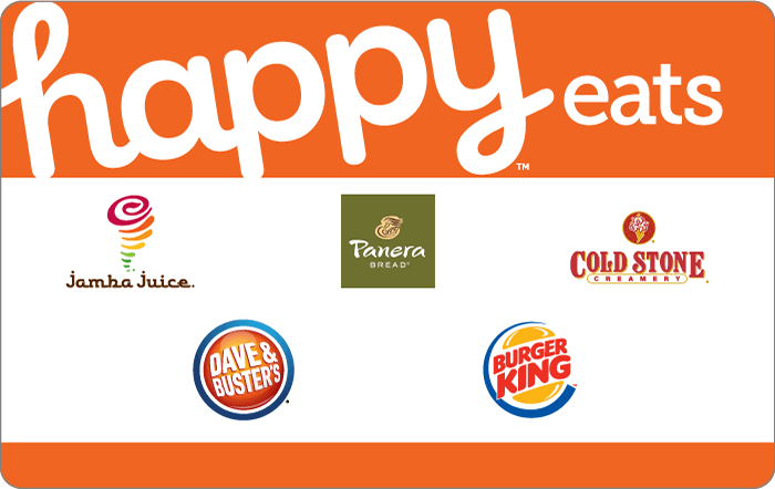 Its like sending a Happy Eats gift card or Happy Eats gift certificate except that the recipient has more flexibility in how they spend it. Terms Conditions. Up to 5 cash back Use the Happy Eats gift card at any Jamba Juice Dave Busters Panera Bread Burger King or Cold Stone Creamery location in the US.